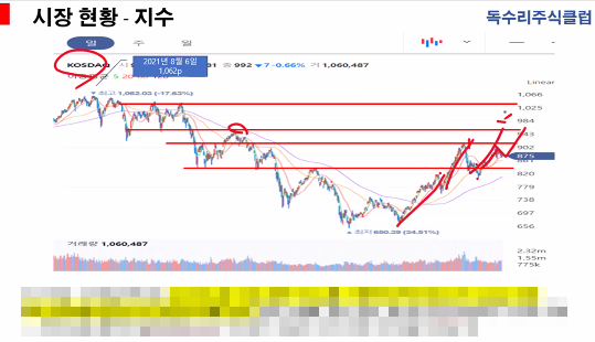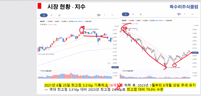 주가 최고점 3,316포인트를 찍은 2021년 6월 25일과 같은 날인 오늘 디지털 공방카페에서 독수리주식클럽 두란님의 재능기부강의가 있었다. 시장현황, 지수, 삼성전자 대응, 미국주식의 나스닥, 환율, 채권까지 최고의 강의였다.